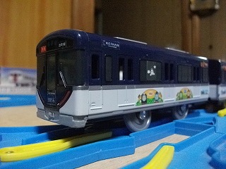 | ■私鉄通勤車両(京阪電鉄) 8000系 3000系 3000系(きかんしゃトーマス号2013) 10000系(きかんしゃトーマス号2011) 10000系(きかんしゃトーマス号2013) 10000系(きかんしゃパーシー号) 10000系(きかんしゃトーマス号2015) 700形(きかんしゃトーマス号) | ![]() ▲京阪3000系電車(きかんしゃトーマス号2013) 京阪電鉄が中之島線(天満橋〜中之島)を2008年10月に開業した際、それに併せてデビューした京阪電鉄の最新型通勤電車(快速急行用車両)。そのうち3006編成がきかんしゃトーマスの装飾を施され、きかんしゃトーマス号2013として運転された。 ![]() ▲Mc3056 ![]() ▲T3506 ![]() ![]() ▲Mc3006 京阪電車の通信販売サイト(e-kenetマーケット)で購入しました。この年に運転された10000系きかんしゃトーマス号(10006F)及びパーシー号(10001F)と含めれば、装飾は控えめであり、8両編成全体・もともとから優等列車用といて増備されていた同形式の事を踏まえれば、このくらいの装飾でも派手ということでしょう。 | |